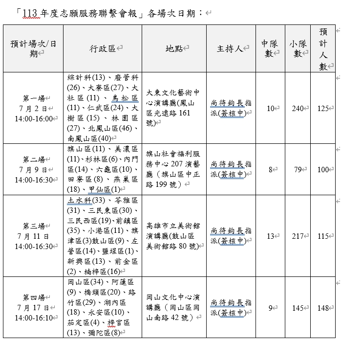 - 為因應本市幅員遼闊,志工隊散布各行政區,本案以分區座談方式辦理「113年度志願服務聯繫會報」(如下列場次)。
