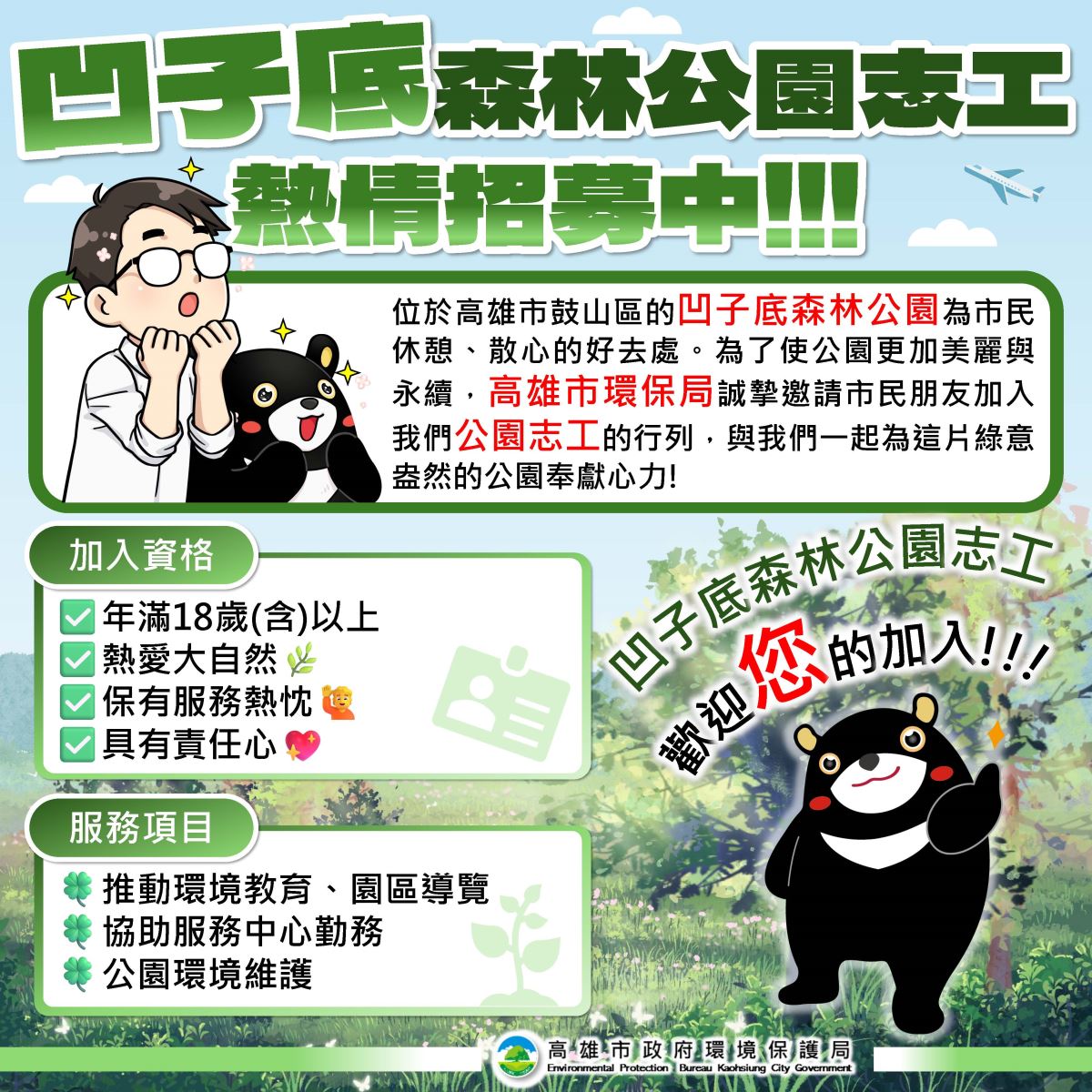 In order to make the park 🌳 more beautiful and sustainable, the Kaohsiung City Environmental Protection Bureau is currently recruiting environmental volunteers 🚩 for Aozidi Forest Park 🙋🙋♂️. We sincerely invite citizens 👫 to join our volunteer 💖 ranks and work with us to contribute to this green park 💪 and promote environmental protection 🌻 and education work 🧑🏫.